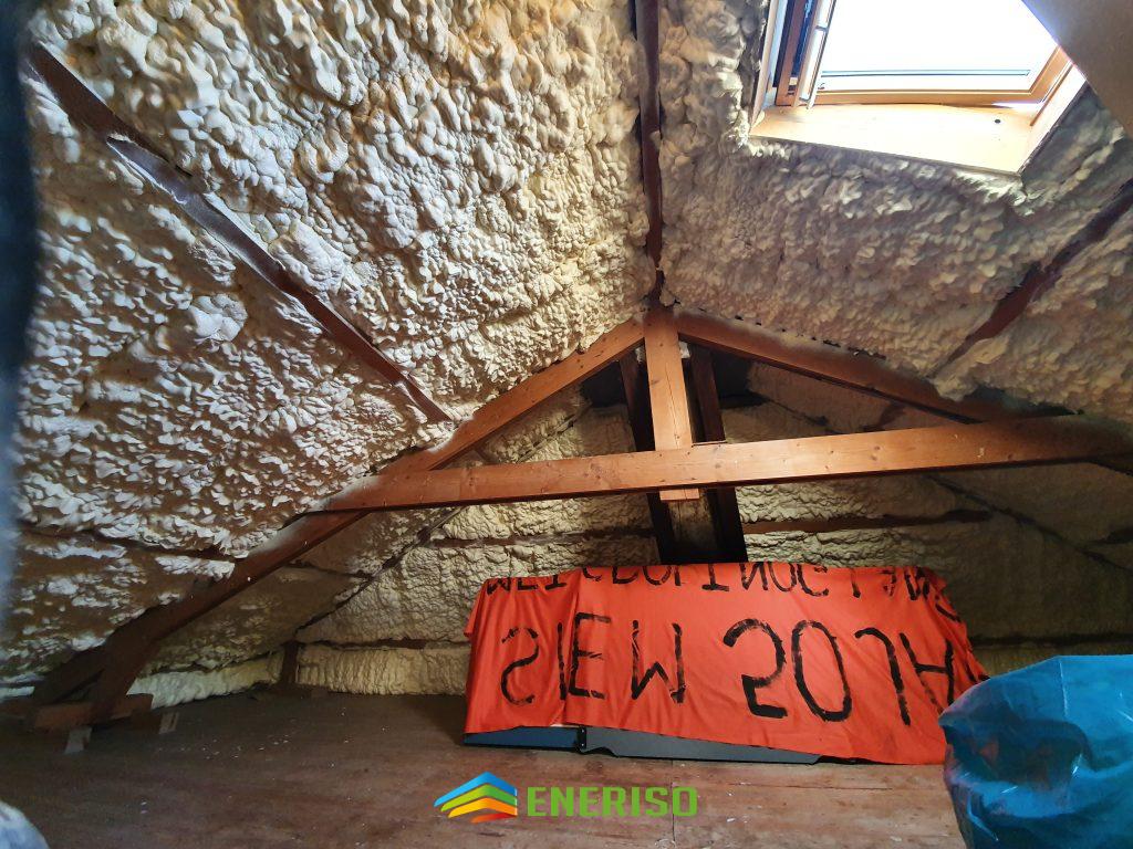 Icynene dakisolatie in Avenhorn. Icynene is een milieuvriendelijk water geblazen isolatieschuim, licht van gewicht, geurloos en hoge isolatiewaarde.